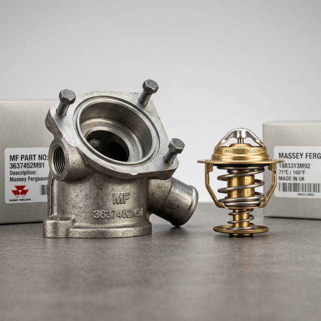 Engine thermostat and housing assembly for Massey Ferguson tractors. Maintains correct operating temperature with a wax-element thermostat that opens precisely at the specified temperature.